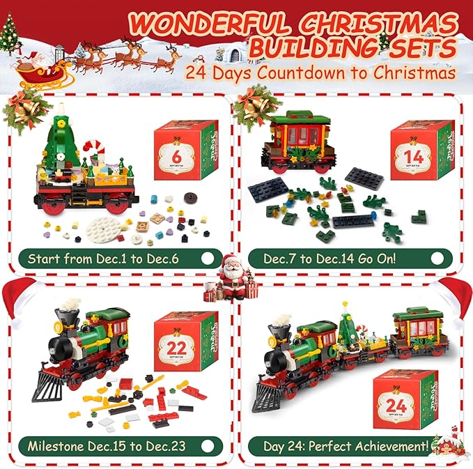 - 🌟 ADVENT CALENDAR 2025 BUILDING BLOCKS SET: Experience daily building surprise with our Christmas Train Advent Calendar. From December 1st to Christmas Eve, open one of the 24 numbered boxes to discover a new bag of bricks. Each day, build a unique section of the Christmas train playset. Enjoy a fun and exciting way of 24 days Christmas countdown. Watch your Christmas display grow, and turn the anxious wait for Christmas into a month-long festival of anticipation and family fun