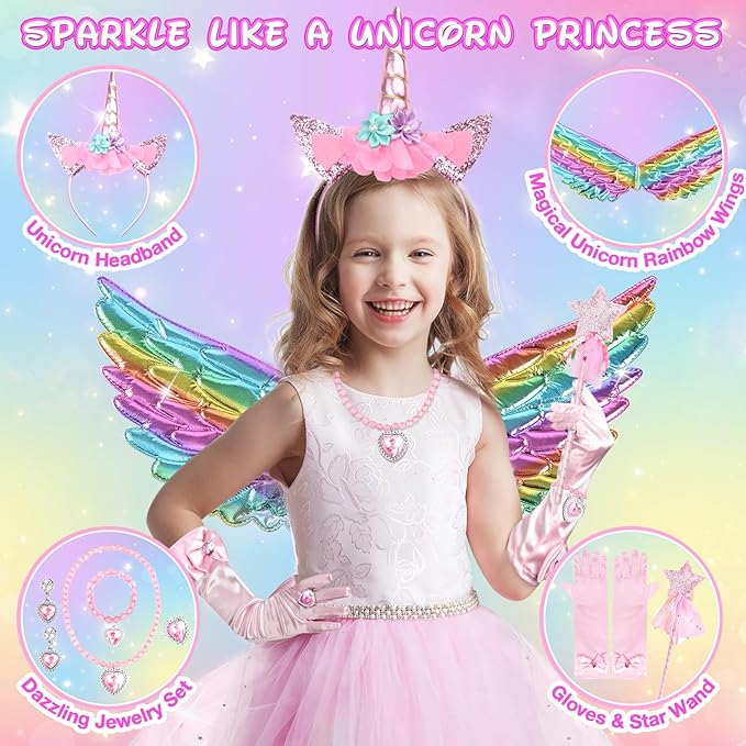 - 【SPARKLE LIKE A MAGICAL UNICORN】More than a kids tea set—it's a whimsical journey into a unicorn fairyland. From the shimmering rainbow wings and star-tipped magic wand to the glittery unicorn headband, dazzling jewelry, and elegant gloves, every detail is crafted to let your little girl shine with imagination and joy! Perfect for tea parties, birthdays, Halloween, performances, themed cosplay events, or carnivals.
