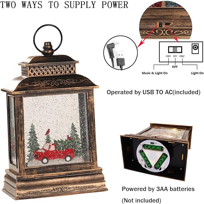 - 🔹【Unique Nativity Scene Design】It is a nice christmas snow globes that light up with Christmas tree &Red car Scene .We can put the nice snowglobe set for christmas indoor. It's shinning with LED lighting on the top of scene.