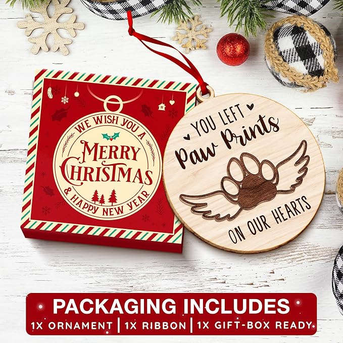 - COMPLETE MEMORIAL PET ORNAMENT SET Included in the set is a beautifully crafted Round Wood pet memory ornament, adorned with a satin hanging ribbon and a festive gift box. Ready for gifting, this memorial dog ornament or pet remembrance gift dog is perfect for gifting pet memorial gifts for dogs, cat parents, or anyone coping with the loss of a pet, delivering solace when needed most.