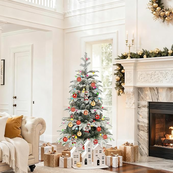 4Ft Pre-Lit Artificial Snow Flocked Christmas Tree, PE & PVC Mixed Layered Christmas Tree Hinged Tree with Lights and Metal Stand, Slim Xmas Tree for Holiday Decor