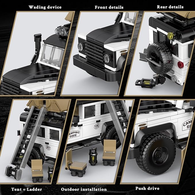 - 【Promise of Quality】This car models kits to build features a turning wheel steering, moving parts of snorkel and rock slider, expedition luggage rack and tent on it, also ladder 2 tourist chairs and a lantern included giving the exact look and feel expected by fans, hobbyist brick builders and car enthusiasts.
