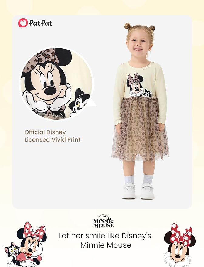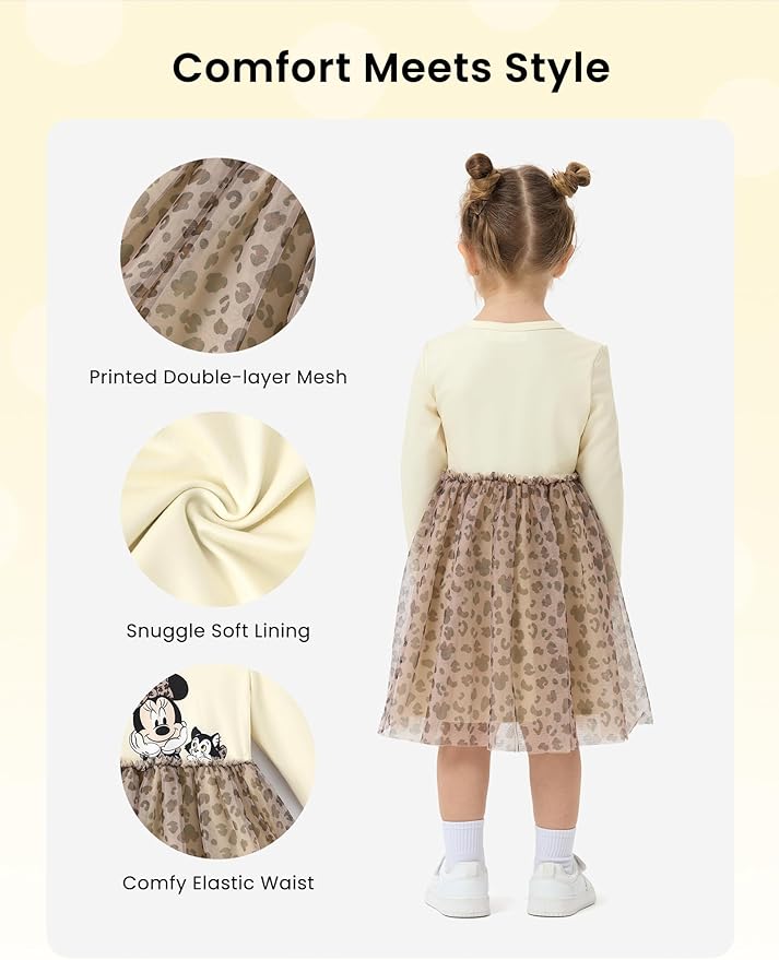 - Minnie Mouse Leopard Print Dress for Girls: This stylish dress features a cute Minnie Mouse graphic with her signature bow, paired with a playful leopard print tulle skirt. The soft long-sleeve bodice and lightweight, breathable fabric make it comfortable for all-day wear, perfect for school, parties, or casual outings