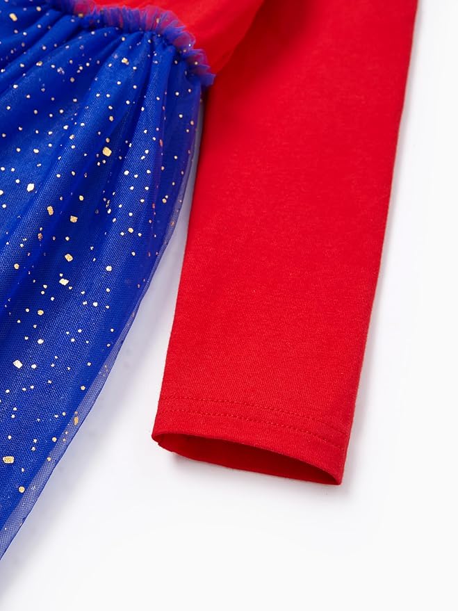 • Vibrant Spider-Man Design with Glittering Tulle Skirt: This dress features a red long-sleeve top with a Spider-Man graphic and a blue tulle skirt with subtle glitter. Perfect for dress-up, playdates, or superhero parties, combining style and imagination