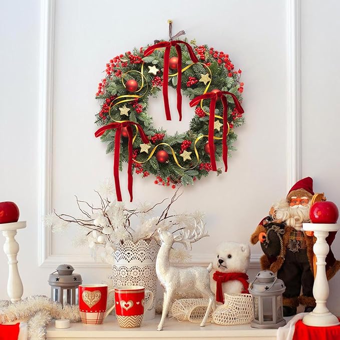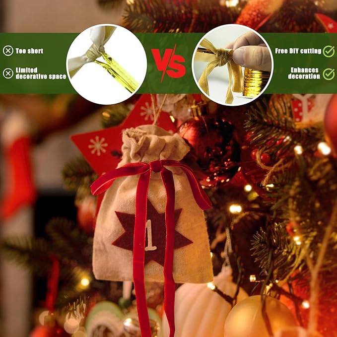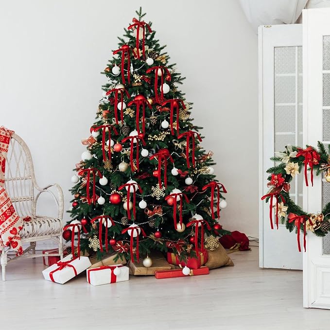 - Velvet Elegance for Your Christmas - Crafted from premium velvet, these christmas bows add a soft, shimmering elegance to your holiday decor. Each package includes 24 pcs of red velvet ribbons, one 15-meter metal tie, and 50 pcs of adhesive dots. Perfect for Christmas tree, gift wrapping, wreaths, or mantel displays.