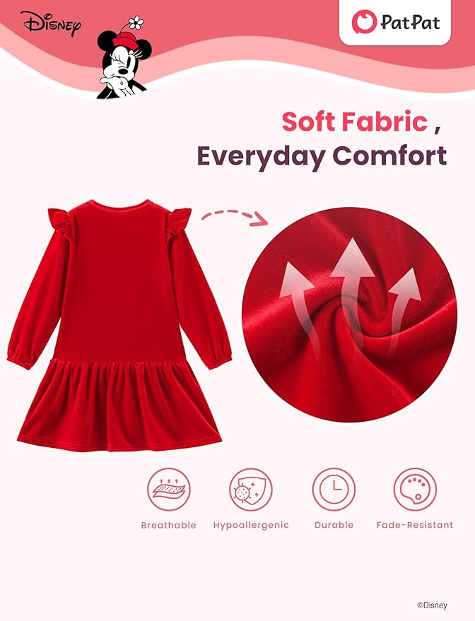 • Charming and Unique Design: This red Minnie Mouse Christmas dress is made from vibrant red velvet and features a large Minnie Mouse print on the front. The long sleeves have ruffled cuffs, and the fluffy skirt adds volume and movement. The elastic waistband ensures a secure, comfortable fit, perfect for all day wear and twirling during Christmas celebrations