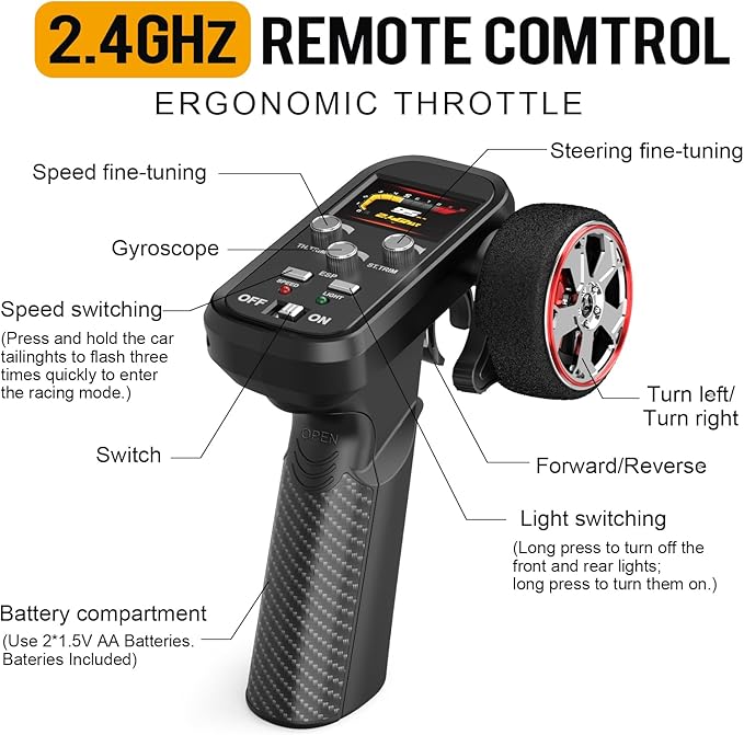 - Multi-color adjustable LED lights - This drift car is equipped with four-color headlights (white/blue/yellow/red) and red taillights, which can be easily adjusted and changed with the remote control. In addition, the car is equipped with a turn signal function, which can simulate the realism of night driving with the remote control, just like driving a real car