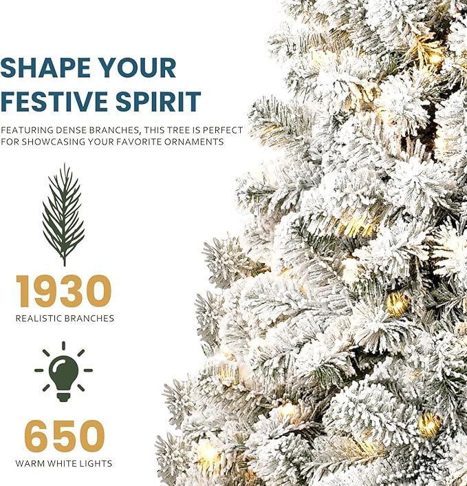- Flocked Design: This 9ft pre-lit flocked Christmas tree features meticulously designed snow-covered branches that mimic the look of a real fir tree, and it is odor-free. Its full and lush shape enhances the realistic appearance, adding a natural charm to your holiday decor