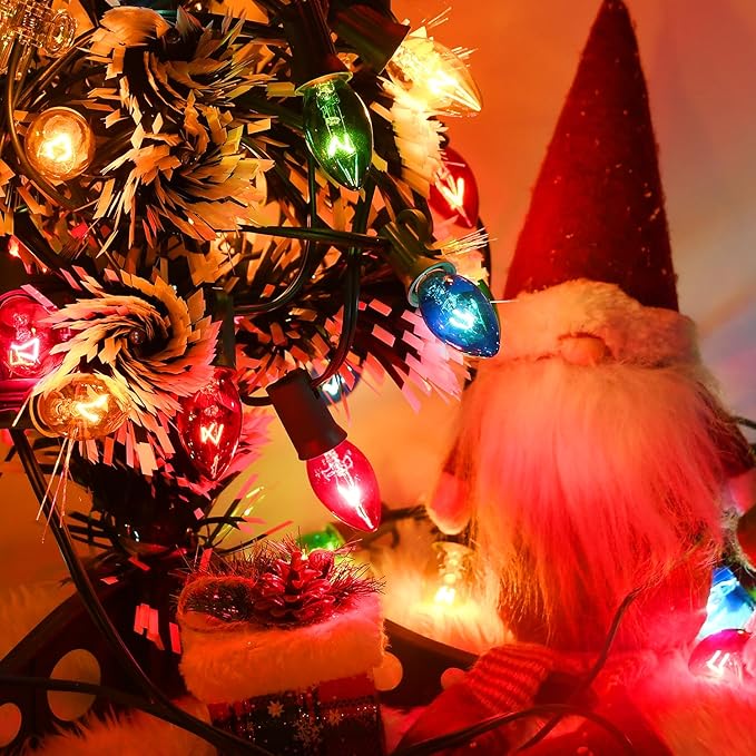 - 💫Widely Used—Outdoor String Lights : The Retro Christmas lights string emit a warm multicolored light that combines with the clear red, green, blue, white, orange C7 light bulbs housings to add a touch of glamorous color. The timeless colored combination is reminiscent of holly and evergreens, recreating the magic of the holiday season.C7 Christmas Lights Outdoor String Lights are suitable for walls, porches, doors and windows, trees, gardens, Christmas tree lights, Christmas decorations outdoor indoor.