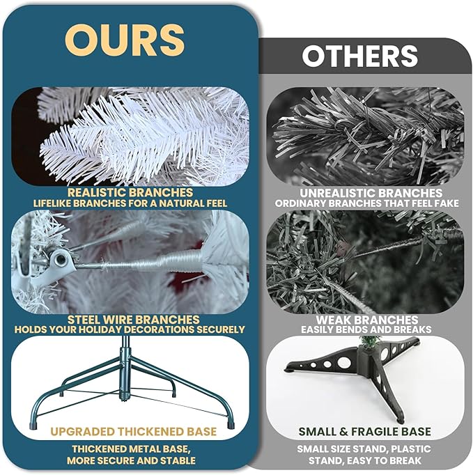 - Premium PVC: Made with thicker PVC, this artificial white Xmas tree is more durable than regular ones. The sturdy material ensures long-lasting use and keeps the Xmas tree looking fresh. Its fire-resistant,odorless,and non-allergenic provide peace of mind, creating a safe holiday atmosphere, even with kids or pets around