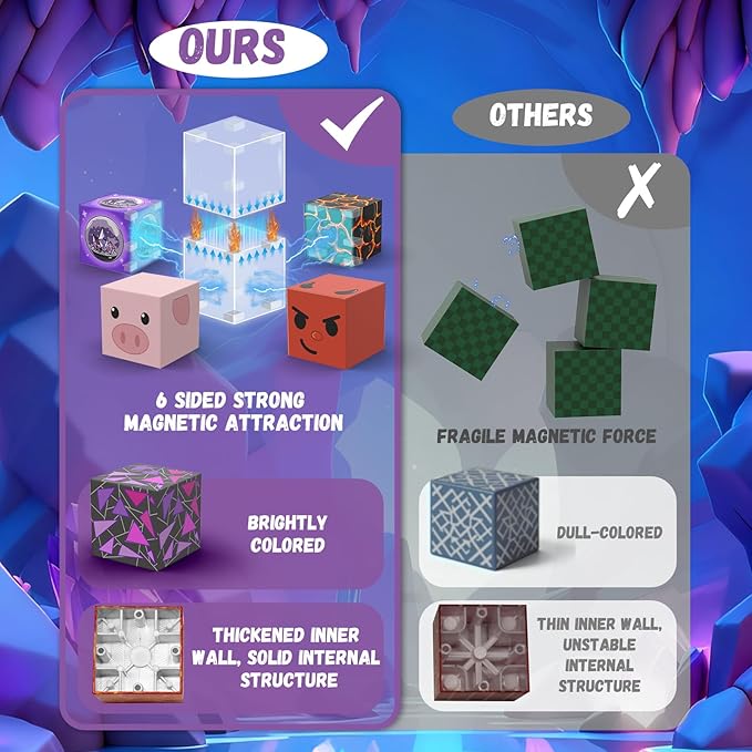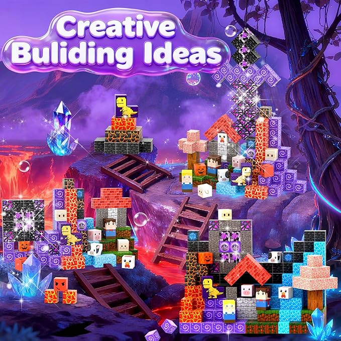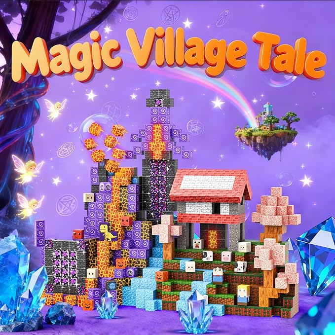 - 【Magical Village Adventure】 Step into an enchanted world with our magnetic blocks! Each 0.8-inch cube fits perfectly in little hands, letting kids build a whimsical village—imagine a glowing purple volcano with magical lava that appears to “flow” with every block adjustment, a blooming farmhouse, and cozy cottages where the farmer’s animals live. Every magnetic "click" adds a touch of magic, making these blocks a fun and beloved toy for both boys and girls—the ultimate magnetic blocks fantasy playset for ages 3 and up.