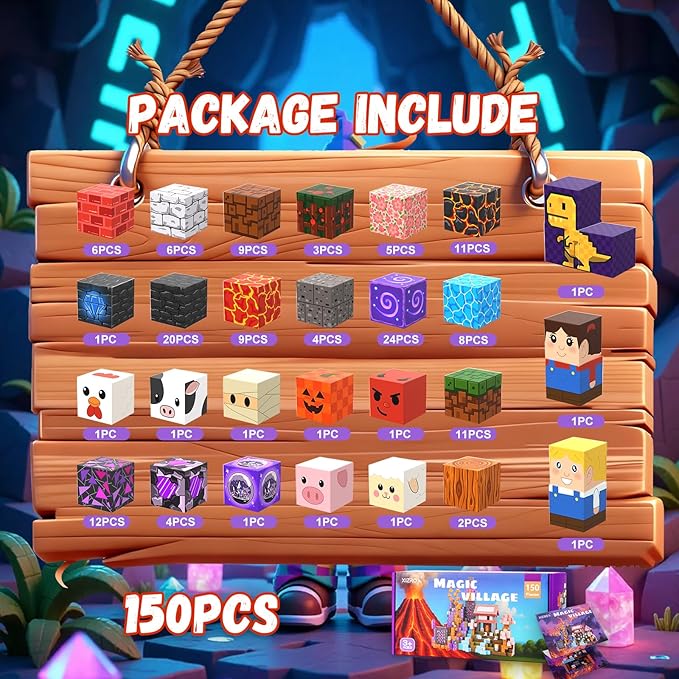 - 【Build Without Limits】 No instructions needed—just pure imagination! Kids can snap these 150 magnetic blocks together to create magical cottages, or even add a waterfall next to the volcano—any stacked design they dream up is possible. This open-ended play boosts creativity and storytelling skills as they craft their own perfect magical village, which is why these blocks are such a hit with boys and girls.