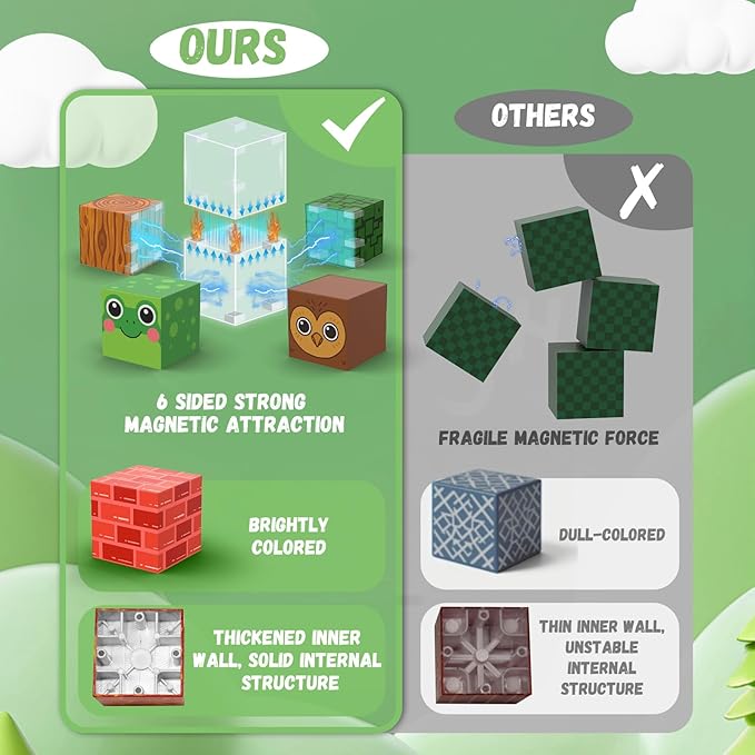 - 【Safe, Durable & Compatible】 Made from premium, non-toxic materials with trusted lab verification. Each magnetic cube features 8 strong magnets for stable builds. They are also compatible with other major magnetic block brands—more blocks mean more wild fun!