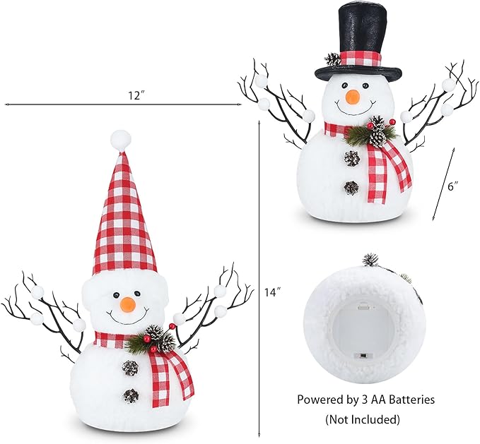 - Lighted Christmas Snowmen: Our Christmas tabletop snowmen wearing plaid Christmas hat and checked top hat are exquisite and well-made, they look pretty on the table as a nice addition to your winter decor.