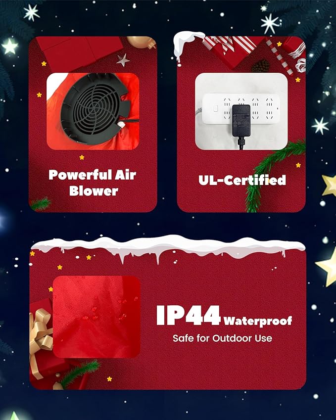 - 🧦 Easy Inflation and Convenient Storage: Simply unfold the inflatable and plug in the ETL-certified adapter for quick inflation. Secure it with the included ropes and stakes. After use, unzip the bottom zipper to deflate, then fold it for quick and convenient storage. Classic Christmas elements ensure this Santa inflatable outdoor can be reused year after year.