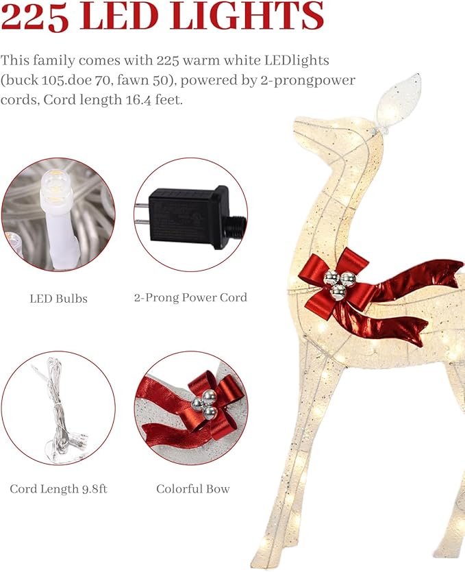 - Dimensions: Each deer in this set of Christmas decorations features exquisite details, including decorative colorful bow and shimmery fabric. The buck measures 32” (L) x 15” (W) x 58” (H), the doe measures 27” (L) x 10” (W) x 43” (H), and the fawn measures 17” (L) x 7” (W) x 29” (H). These 3 exquisite deer christmas decor add a rich Christmas festive atmosphere.