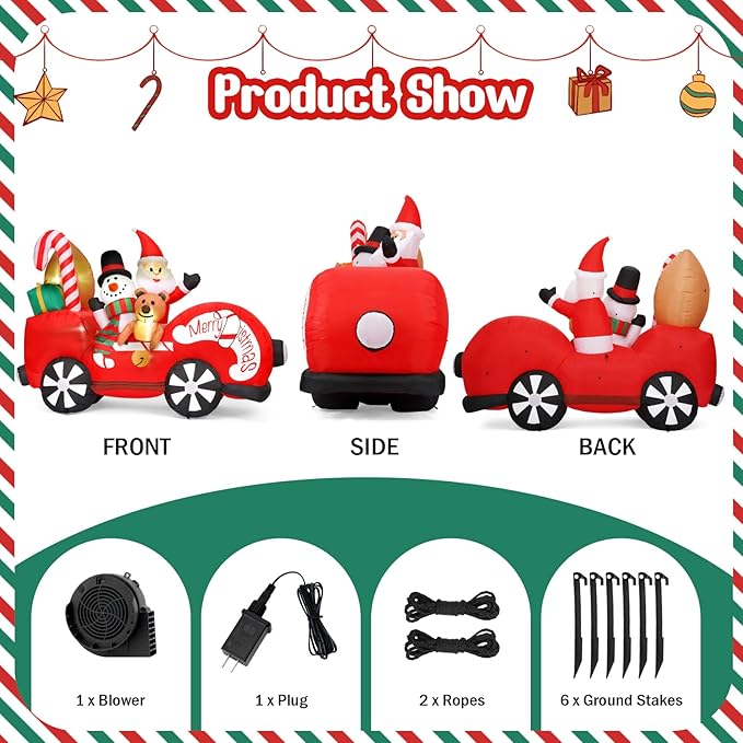- ๐๐ญ๐๐๐ฅ๐ & ๐๐๐๐--This Christmas outdoor decorations come with 8 LED lights, 6 ground stakes, 2 ropes, 1 built-in fan, which will keep the inflatable firmly fixed to the ground.No need to worry our Christmas Inflatable will fly away by the wind. The certified for UL and uses 12 volts, making it even safer