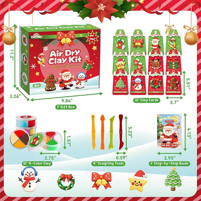 - 🎅12 Christmas Clay Kits – Colorful, Complete & Easy to Create: This air dry clay kit for kids includes 12 mini boxes, each with 4 colors of clay, 4 sculpting tools, and a step-by-step tutorial book. The airtight tins keep clay fresh for next use. Kids can craft 12 Christmas-themed