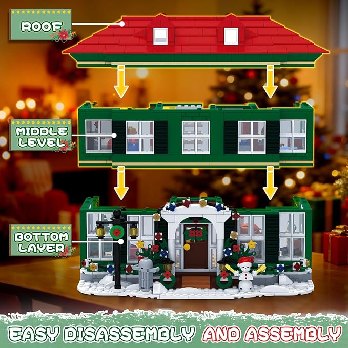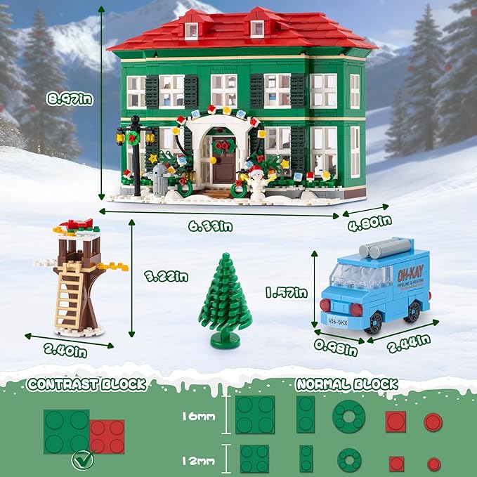 - 【Christmas Holiday House & Home Boy Alone】This Christmas Holiday House Building Block Set draws inspiration from a classic Christmas movie. It features a classic festive color scheme of a red roof and green walls, with abundant details: Inside the house, there are intricate furniture pieces including a sofa, a telephone, cabinets, and a fireplace. Outside, it comes with decorative elements like a blue car, a snowman, a Christmas tree, and a small cabin. It's a highly realistic recreation of a charming miniature Christmas Village house