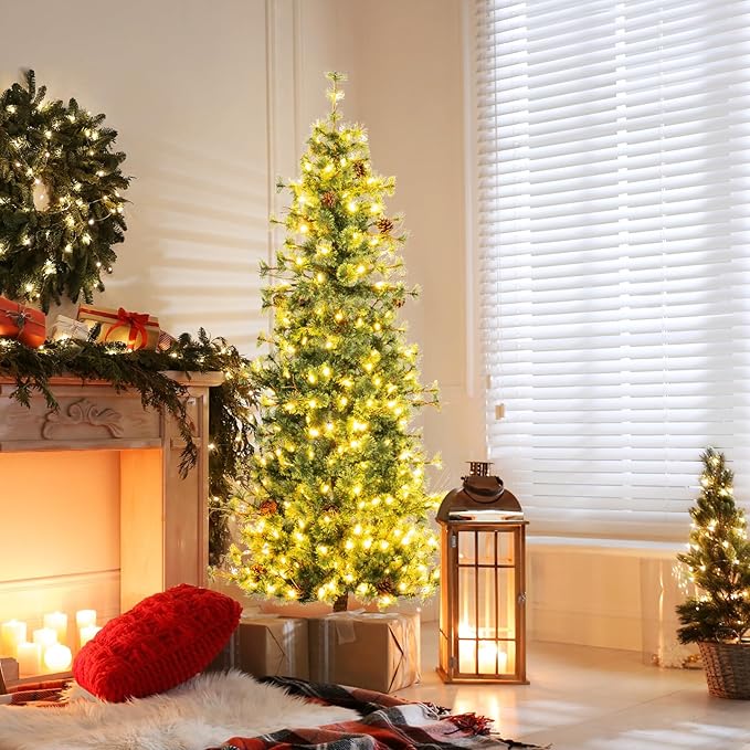 - Stunningly Exquisite Appearance: The 502 lush branch tips with cashmere pine needles will create a lifelike and vivid appearance. Furthermore, the pre-lit Xmas tree is decorated with 28 natural pine cones and real withered branches to transform every glance into a festive visual treat.
