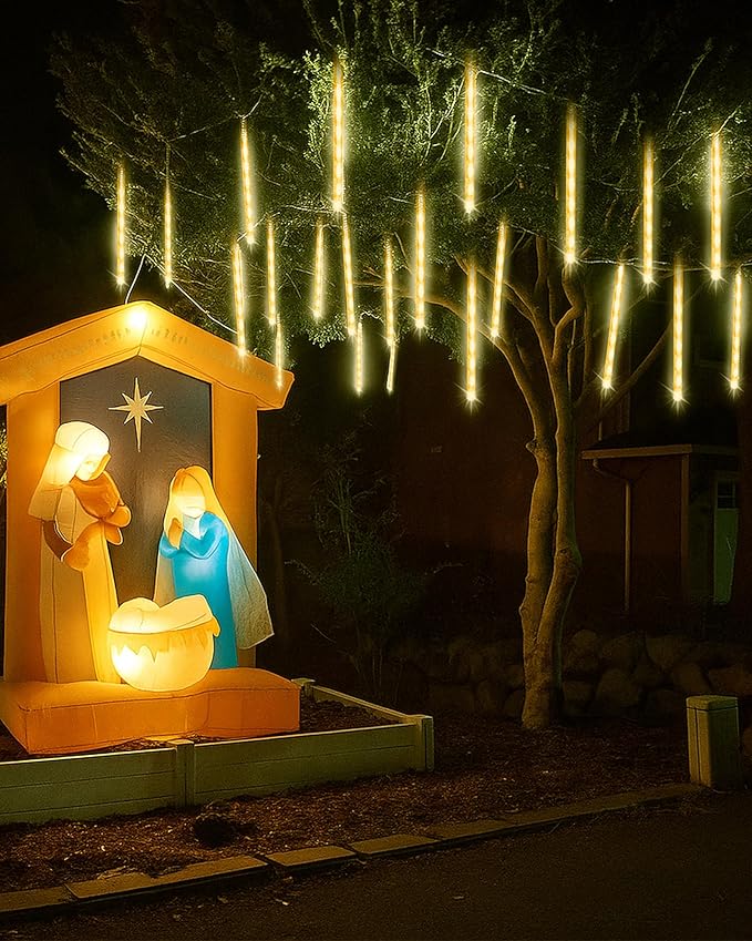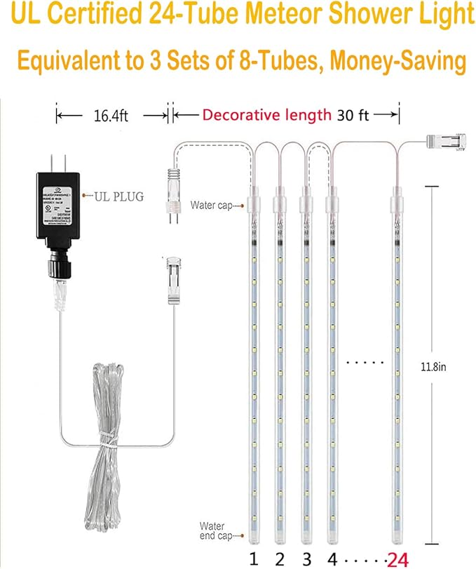 - 【Equivalent to 3 Sets of 8-Tubes, Money-saving】Our 24-tube meteor shower lights has 24 tubes, which is equivalent to 3 sets of 12 Inch 8-tube meteor shower lights in decorative effect, but the price is lower than 3 sets of 8-tube, which is a great savings. Also you don't have to string them up like 8 tubes, making your holiday decorating easier and less time consuming