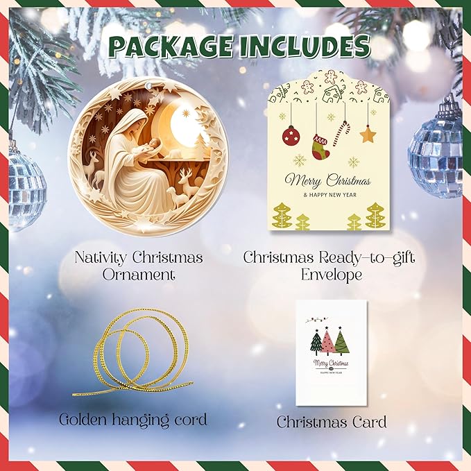 - "β¨ 2025 Dated Christmas Ornament β Nativity Scene: Celebrate the true meaning of Christmas 2025 with this stunning ornament of Mary and Baby Jesus surrounded by stars and nature."