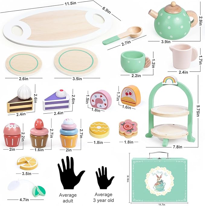 - 【PERFECT TEA SET FOR LITTLE HAND】Dive into a world of delightful and creativity play with iAOVUEBY wooden tea set, designed for toddler girl pretend play, includes 1 teapot, 1 serving tray, 2 cups, 1 creamer pitcher, 2 spoon, 2 tea saucers, 1 plates, 1 tea bag, 1 lemon slice, 1 2-tiered cake stand, 1 cardboard carrying case, 9pcs wooden pretend to play dessert. Let your little one imagination and pretend play with much fun