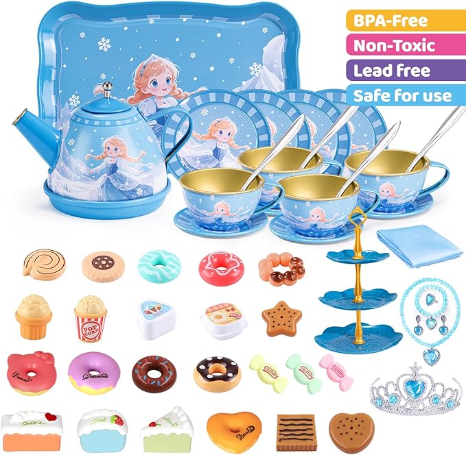 - 【PERFECT TEA SET FOR LITTLE HAND】This adorable kids tea set is designed for pretend play, includes 1 teapot, 1 serving tray, 4 cups, 4 spoon, 4 saucers, 4 plates, 1 crowns, 1 necklace, 1 bracelet, 1 rings, 1 pair earrings, 1 3-tiered cake stand, 1 tablecloth, 1 cardboard carrying case, 23pcs ABS Plastic pretend to play dessert with a variety of donuts, macaron, salad dressings, popcorn etc