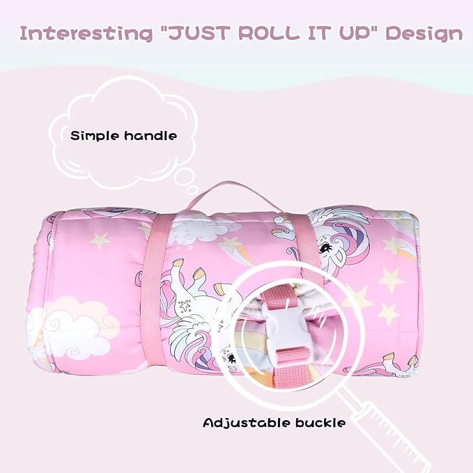 - SKIN-FRIENDLY AND ULTRU SOFT. The nap mat is made of soft cotton fabric and filled with fluffy cotton. And we choose the pretty colors and playful designs to make the nap time more interesting and sweet for your kids.