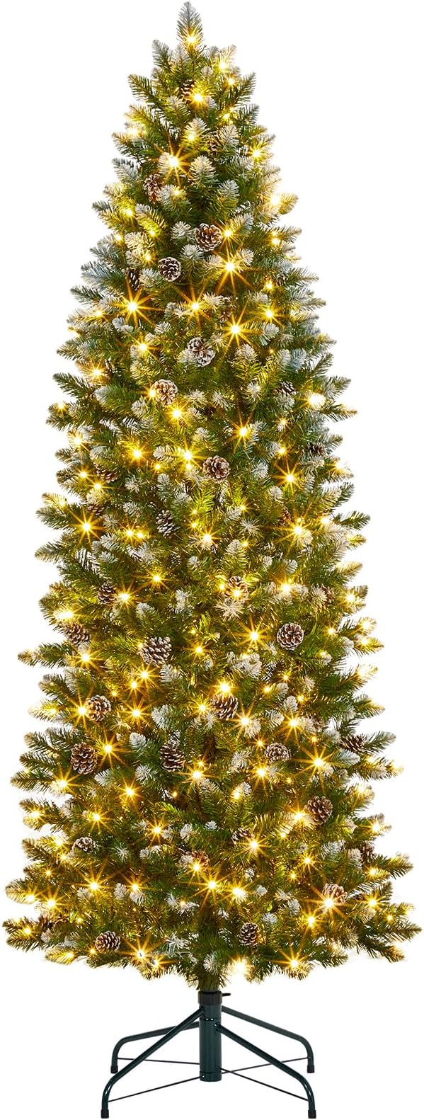GAOMON Slim Artificial Christmas Tree, 6ft Pre-lit with 400 Warm White Lights, Pre-Decorated 60 Pine Cones & 700 Flocked Tips, for Home Office Party Decor (Xmas, New Years) Includes Metal Stand