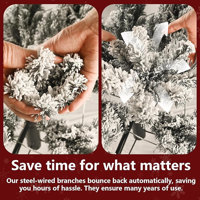 - Snow Tree:Flocked Christmas tree features snow-like branches that won't shed, mimicking natural snowfall without needing spray. With thick, durable branches,it lasts 3-5 years. Available in 5-9 ft sizes, the small size fits corners or entryways, while the large size is perfect as a living room centerpiece