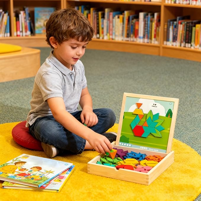 - Interactive STEM Learning: Foster creativity, problem-solving, and spatial reasoning with this wooden magnetic tangram pattern block set, perfect for children to explore shapes, colors, and geometry at home, school, or classroom activities